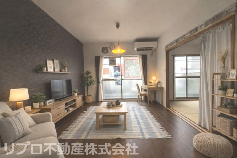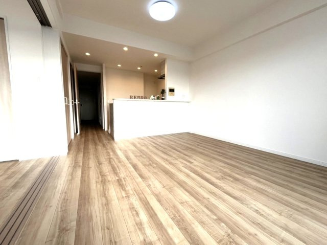 【居間・リビング】対面キッチンとリビングは約13.3帖、南西向きでとても明るく暖かい室内です♪